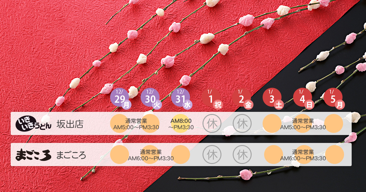 営業日の営業時間については以下の通りです。[いきいきうどん 坂出店] 12月31日はAM8:00からPM3:30までの短縮営業となり、それ以外は通常通りAM5:00~PM15:30の営業です[まごころ] AM6:00~PM3:30(通常通り)
